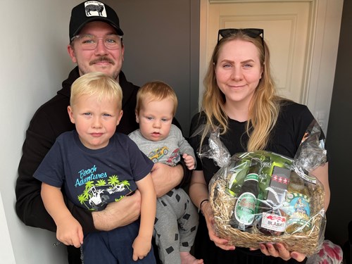 Præmien var en købmandskurv som blev vundet af Karoline Vinther fra Ganløse, Her ses hun sammen med familien ved overrækkelsen af præmien.